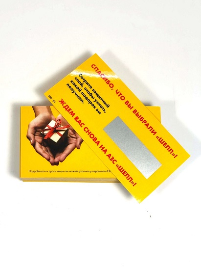 Так называют карточки с защитным слоем при стирании которого обнаруживается информация ранее напечатанная на носителе. Носителем чаще всего выступают карточки размером с визитку изготовленные на бумаге 200-300 грамм. Но это может быть и пластиковая карта со скретч слоем. И уже на эти карточки наносится скретч слой который уже удаляет (например, монеткой) пользователь. Кроме использования бумаги можно заказать изготовление скретч карт на пластике, это будет более представительно и используется для многократного применения.
